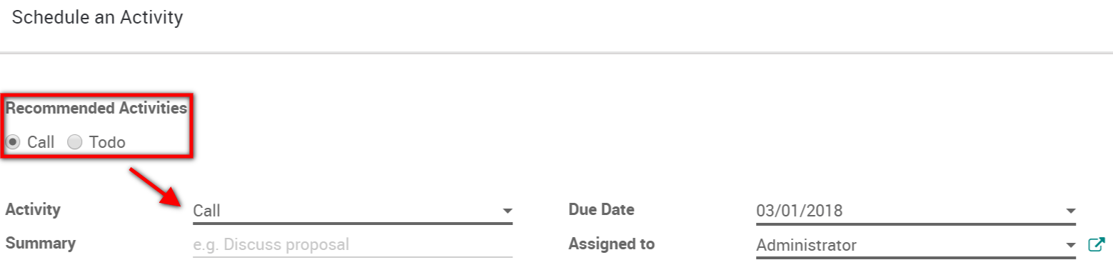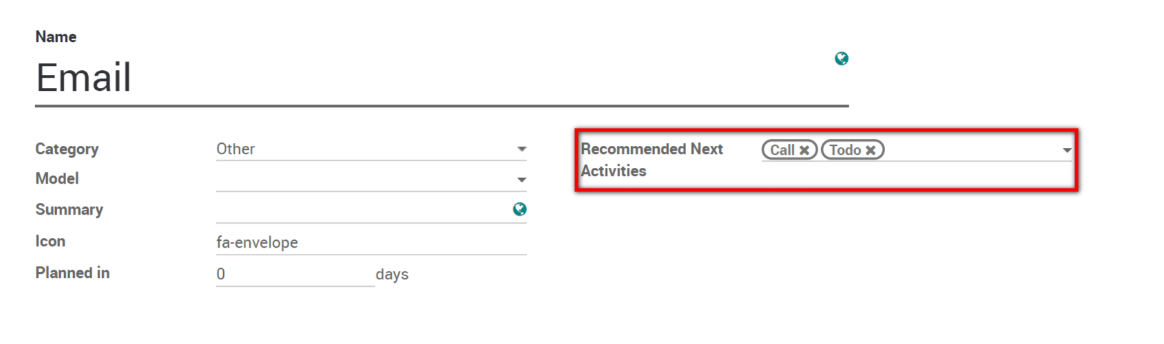 Odoo vous aide à planifier aisément votre flux d'activité habituel. Allez dans et indiquez comme Activités suivantes recommandées les étapes génériques ci-dessous..